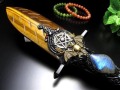 美しいキャッツアイ効果を放つタイガーアイに加え、ハンドル部分にはラブラドライトを大胆に埋め込んだ豪華仕様。