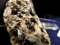 土色の岩石表面にはガラスのような光沢が見られ、そこには柱状の結晶が散在しています。