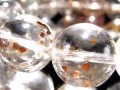 透明度の高い水晶体の中に、斑点状・鱗片状に広がる琥珀色の内包物が浮かび、落ち着きのある輝きと深みを演出しています。