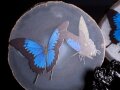 ★デザイン瑪瑙(メノウ)プレート★使い方様々★アゲートコースター★いろいろな角度で楽しめる2way★【アゲハ蝶デザイン】アゲートスライスプレート 置物★【タイプA】石サイズ縦約10-12cm★華やか木製台座付き★【ブラジル産】