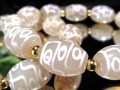グレーホワイトの地の色に、ホワイトの各天珠模様が描かれてた、可愛らしい仕上がりの玉髄(カルセドニー)天珠を使用した、目を引くデザインになっており、気軽に天珠をお楽しみいただけます。