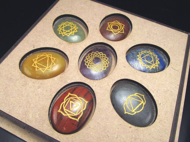 ◆7種のヤントラ刻印&7色チャクラタンブル◆チャクラ刻印デザインケース◆大人気スピリチュアルグッズ◆古代インドから伝わるエネルギー補給◆7チャクラタンブルボックス◆ボックスサイズ約16.5×16.5cm 高さ1.7cm◆【タイプB】