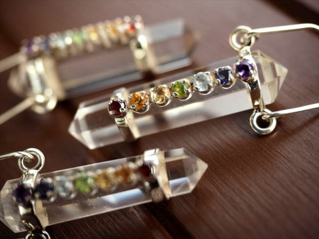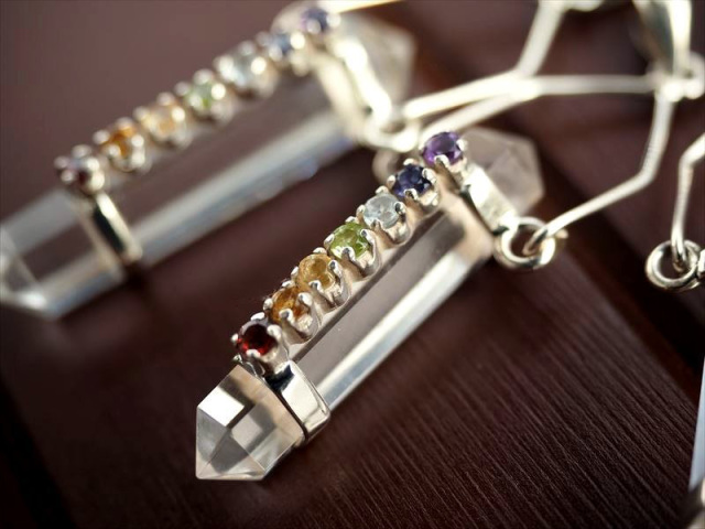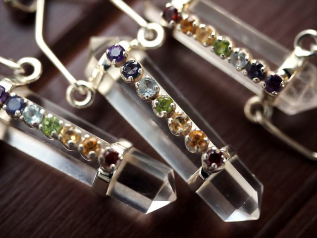 ◆人気のダブルポイント型◆チャクラストーン7種◆5A◆ツーソン展示会商品◆7チャクラストーン付 水晶ダブルポイントペンダントトップ◆Silver925◆石サイズ縦約38.5mm◆全長約6.5cm◆【ブラジル産】