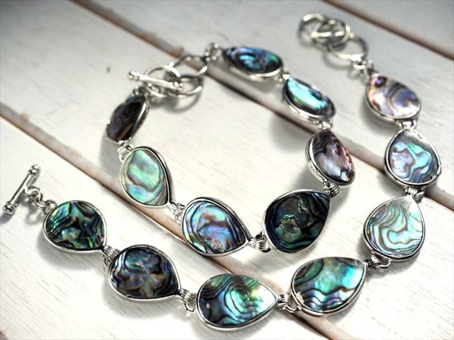 ★虹色光沢!レインボーカラー★デンバー展示会商品★上品な輝き★アバロンシェル【アバローニ貝】・シルバーブレスレット★粒サイズ約20mm×7粒★手首サイズ約17-19cm★3段階サイズ調整可能★【ニュージーランド産】