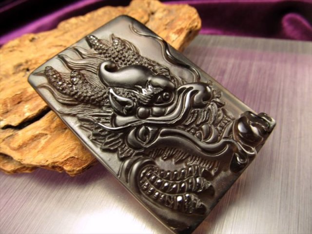 • ◆特大サイズ・ドラゴンフェイス◆浄化・魔除け◆お守りとしても◆透明オブシディアン【黒曜石】龍彫り カービングプレート◆縦約60mm◆【メキシコ産】◆OBP24◆