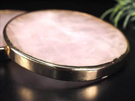 • ◆極上結晶贅沢使用!◆しっかりとした厚みのあるコースター◆高級感あるゴールドフレーム◆アクセサリートレイやインテリアにも◆美と愛の女神の石◆ローズクォーツ【紅石英】ラウンド型プレート◆直径約10cm◆厚さ約1cm◆【マダガスカル産】