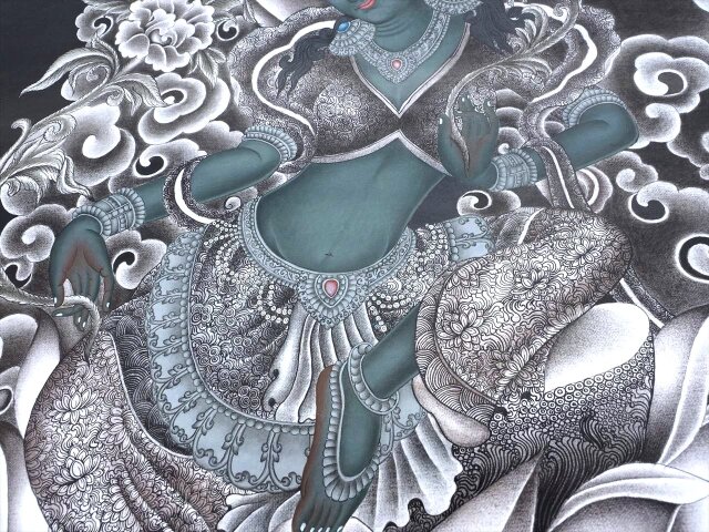 ◆【限定入荷!色彩の美】精密画(タンカ)◆現地より直送!僧侶・タンカ絵師による肉筆◆貴重な本物・曼荼羅(マンダラ)◆1点物◆チベット仏教 悟りの図像・仏教美術◆100%木綿(コットン)台紙◆グリーンターラー タンカ◆サイズ約60×47cm◆