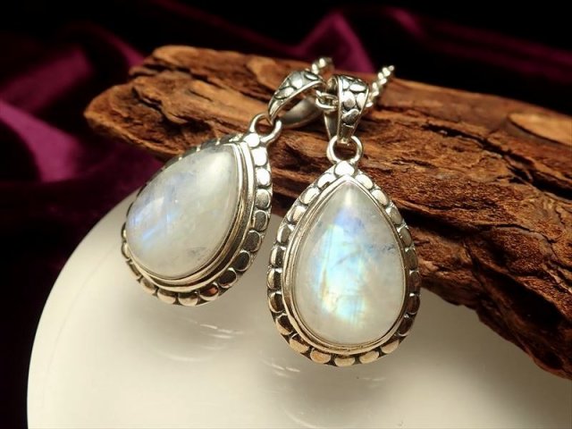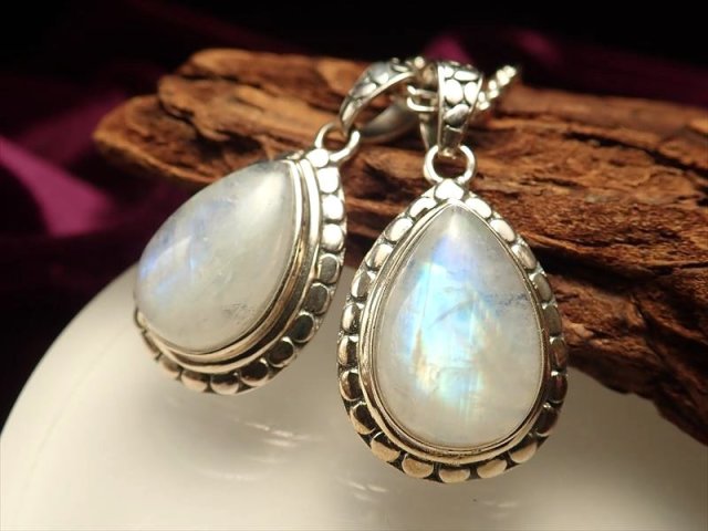 ◆レインボーシラー◆精巧なシルバー彫金◆ツーソン展示会商品◆永遠の愛の象徴◆1個3480円◆ムーンストーンペンダントトップ◆ドロップ型◆Silver925◆縦約23.5mm◆【インド産】