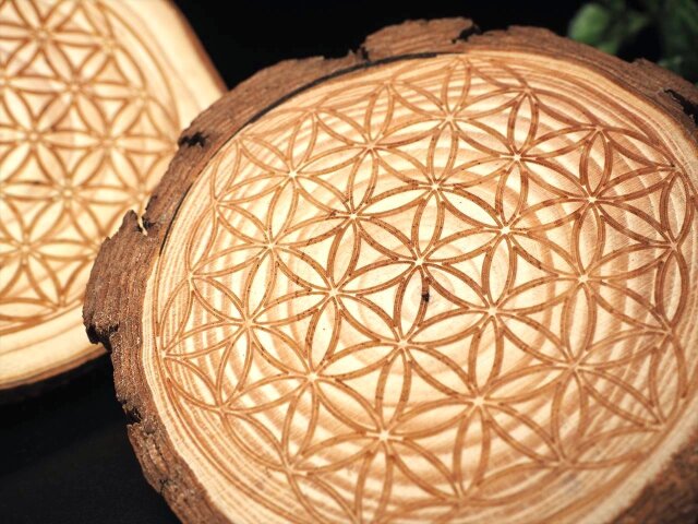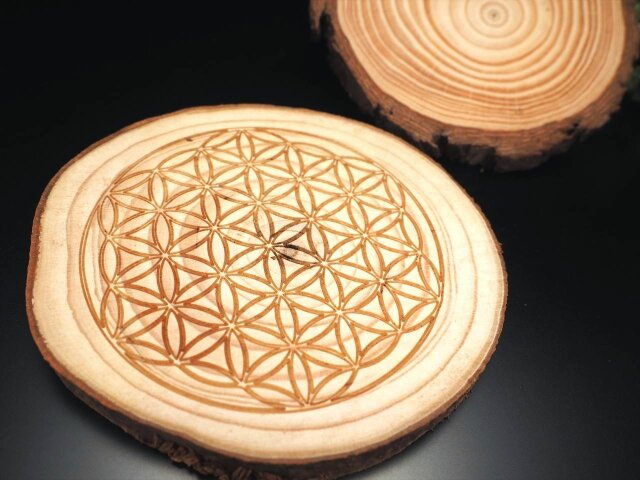 ◆神聖な彫刻入りのウッドプレート◆パイン材使用◆温もり感じる無垢材◆インテリアのポイントに◆スライスウッドプレート◆最大幅約10-11.5cm◆【タイプA】