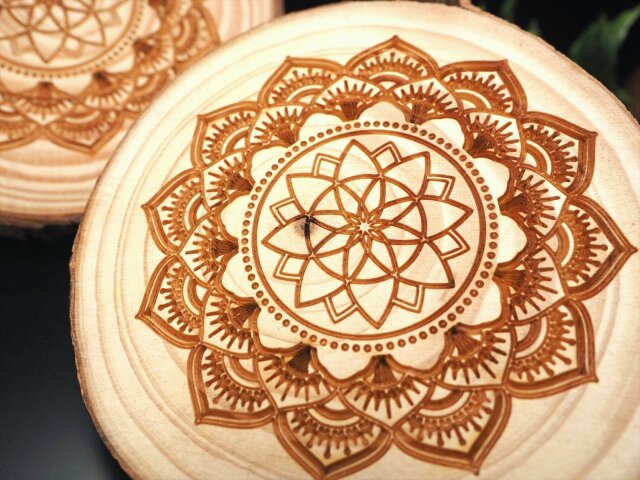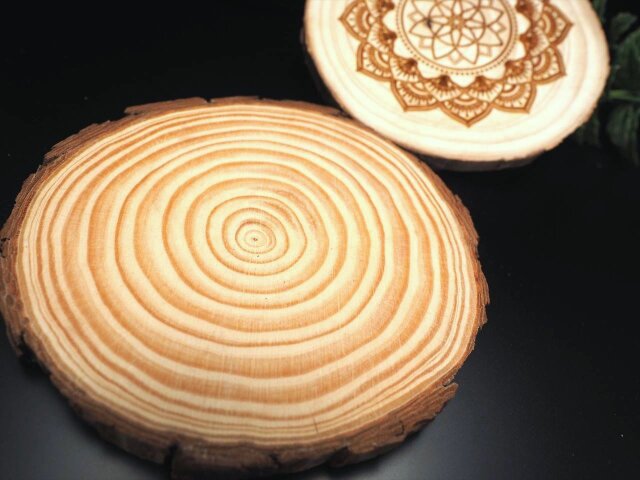 ◆神聖な彫刻入りのウッドプレート◆パイン材使用◆温もり感じる無垢材◆インテリアのポイントに◆スライスウッドプレート◆最大幅約10-11.5cm◆【タイプB】