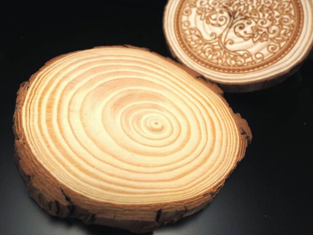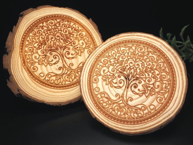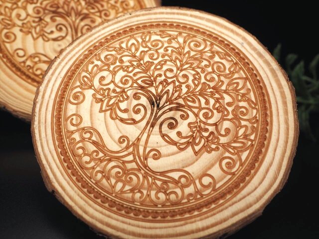 ◆神聖な彫刻入りのウッドプレート◆パイン材使用◆温もり感じる無垢材◆インテリアのポイントに◆スライスウッドプレート◆最大幅約10-11.5cm◆【タイプC】
