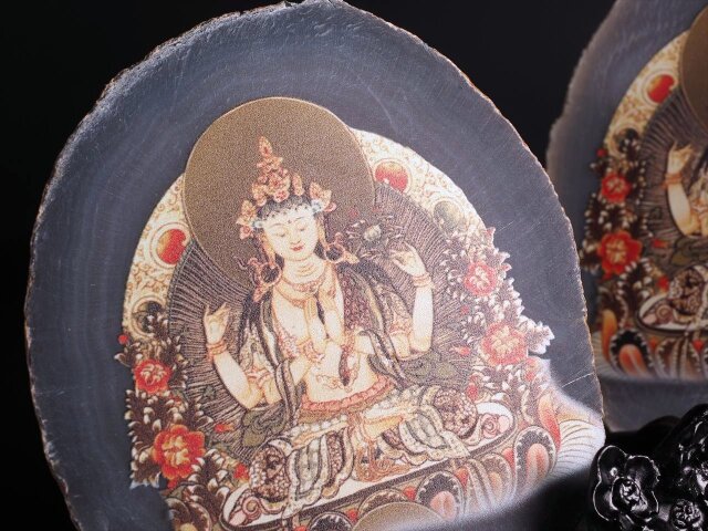★デザイン瑪瑙(メノウ)プレート★使い方様々★アゲートコースター★いろいろな角度で楽しめる2way★【六字世自在菩薩デザイン】アゲートスライスプレート 置物★【タイプD】石サイズ縦約10-12cm★華やか木製台座付き★【ブラジル産】