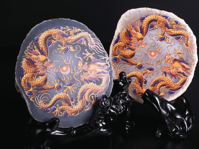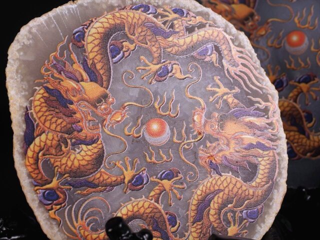 ★デザイン瑪瑙(メノウ)プレート★使い方様々★アゲートコースター★いろいろな角度で楽しめる2way★【五本爪双龍デザイン】アゲートスライスプレート 置物★【タイプI】石サイズ縦約10-12cm★華やか木製台座付き★【ブラジル産】