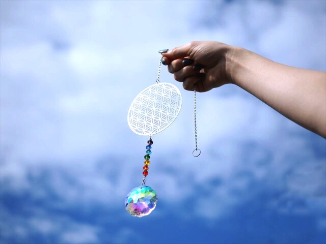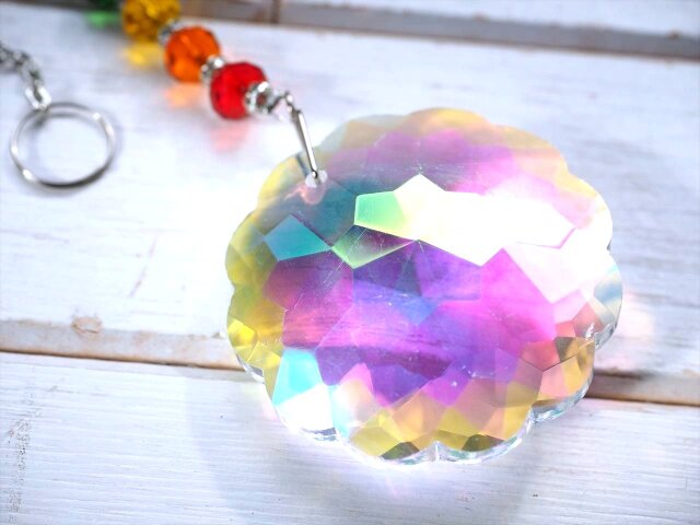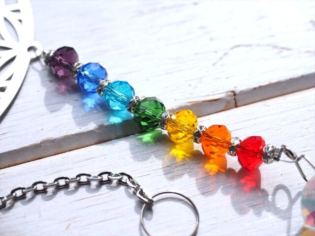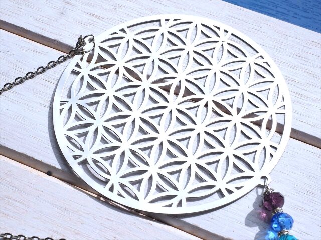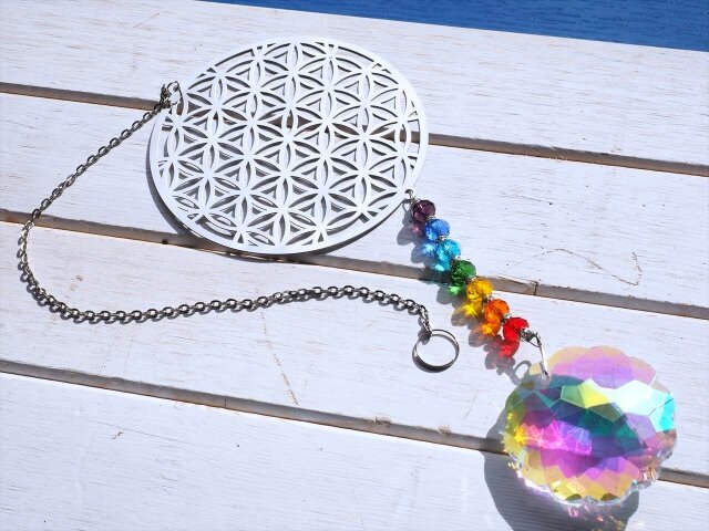 ★フラワーオブライフ【生命の花】デザイン★7色カラー7種チャクラ対応★高品質ビーズクラフト★フラワーオブライフ&チャクラ サンキャッチャー★全長約43.5cm★