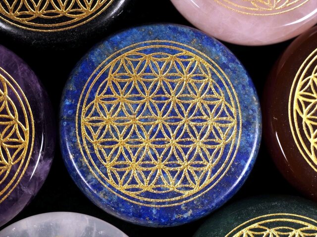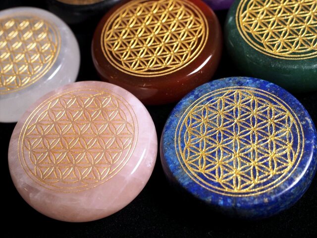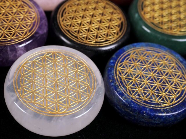 ◆大好評!◆心地よい手のひらサイズ◆調和とバランスを表す図形◆フラワーオブライフ【生命の花】パームストーン◆選べる7種のストーン◆サイズ直径約35mm◆