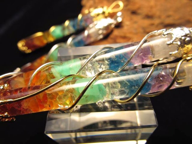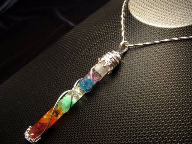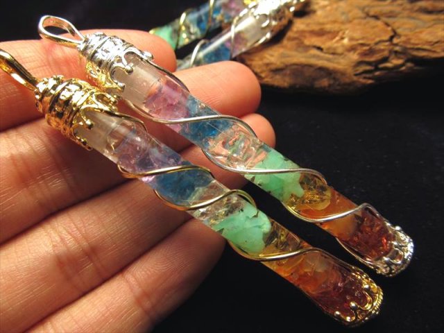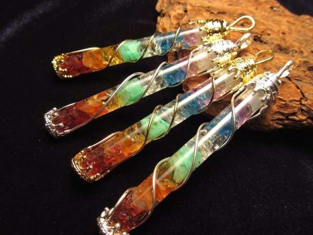 ★クラウン装飾&ワイヤーラップデザイン★ツーソン展示会商品★天然石7種チャクラ対応★チャクラストーングラスチューブペンダント★全長約8cm★シルバー・ゴールド2カラー★